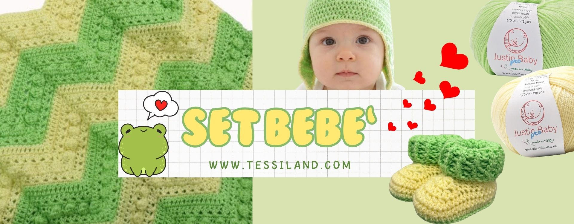Para nuestro set baby hemos elegido el hilo JUSTIN BABY PRO, ideal para recién nacidos, para niños más grandes y para quienes tienen la piel sensible. Hemos elegido este hilo para obtener un resultado esponjoso, agradable al tacto y manejable también para quien quiere lograr un trabajo acabado y definido; los colores elegidos son el VERDE y el VAINILLA trabajados con el ganchillo n.º 3.