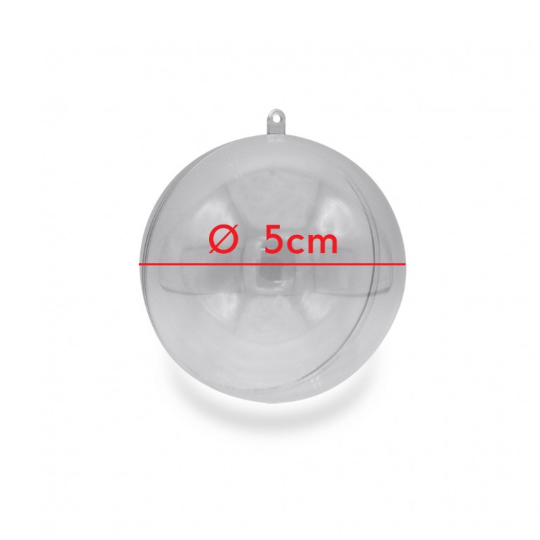 Pallina di Plastica trasparente diametro 5 cm. Idonea al rivestimento, riempimento e alla colorazione. Ideale per realizzare palline di natale Handmade. Confezione 1 pezzo. La pallina è montabile. Con gancio per poterla appendere.